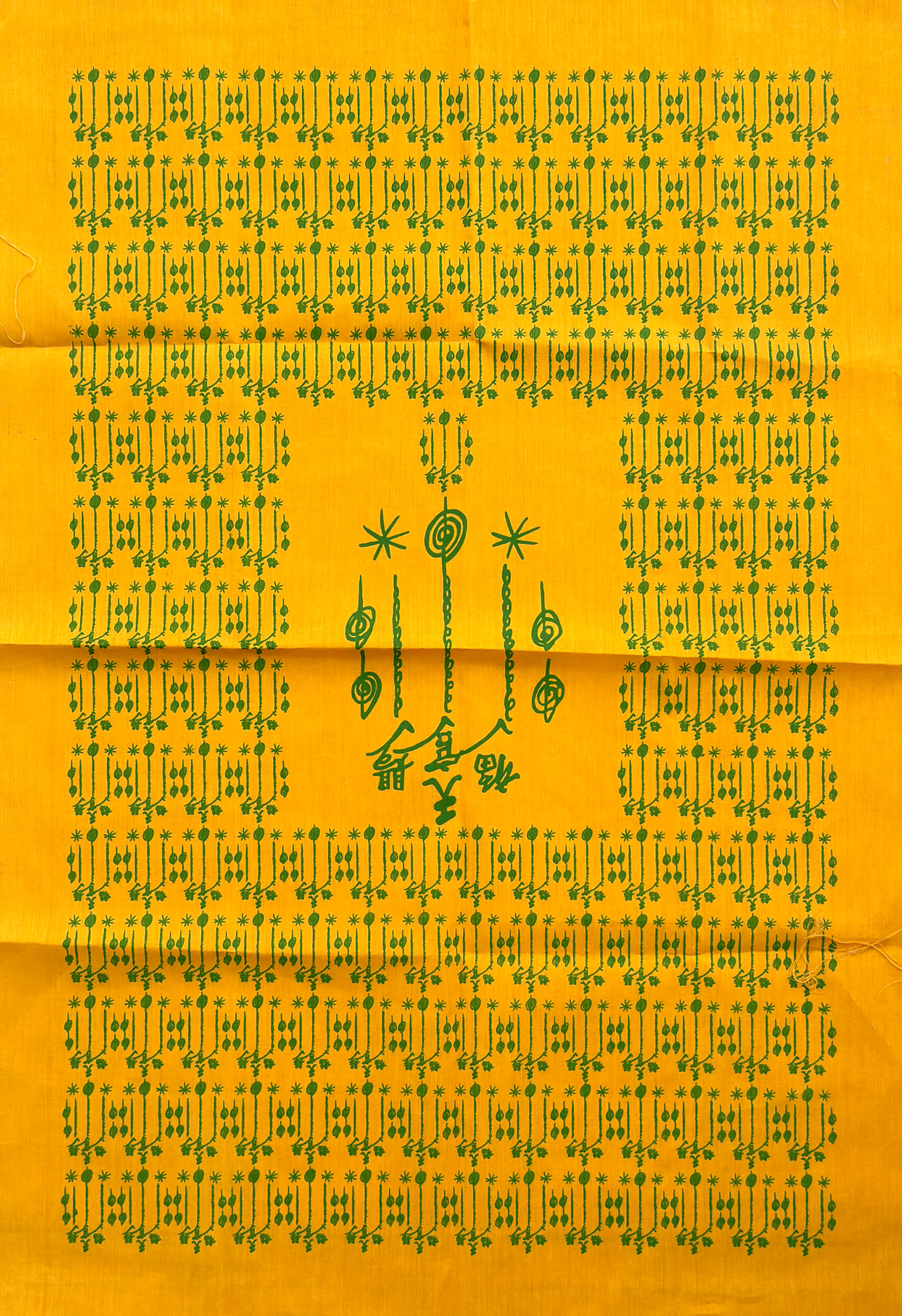 This pha yant features a dense, repeating grid of yantra symbols printed in green on saffron-colored cloth. The repetition creates layered coverage, while the central yantra panel acts as the anchor point for the entire textile. Pha yants of this scale are traditionally used for spatial protection, focusing on territory, boundaries, and environmental stability rather than individual carry.