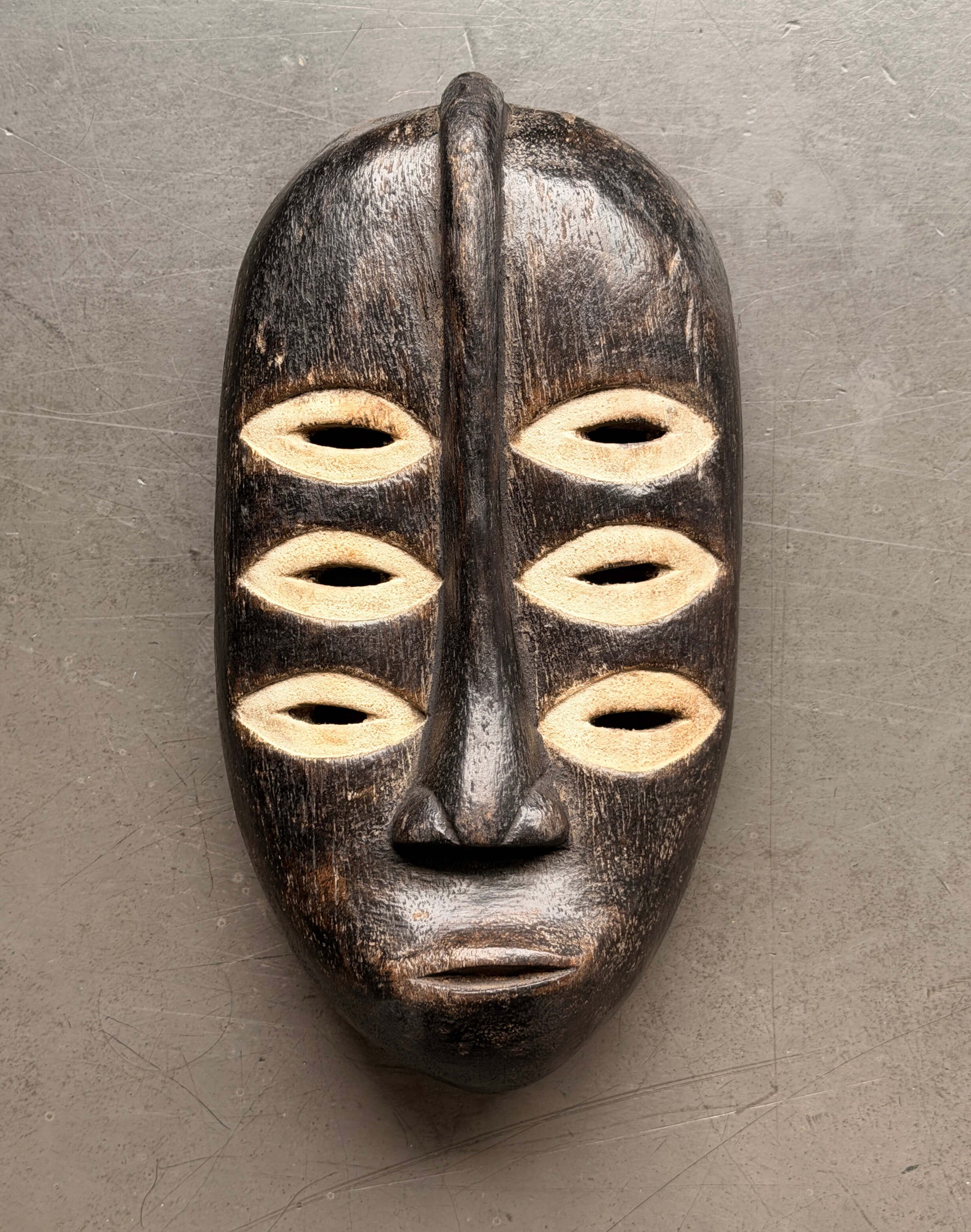 This mask comes from the Dan Guro forest zone of Upper West Africa, a region known for restrained carving and strict adherence to symbolic form. The most striking feature is the vertical stacking of almond-shaped eye slits on both sides of the face. These multiple eyes signify heightened perception, vigilance, and the ability to observe simultaneously across physical, spiritual, and social realms.