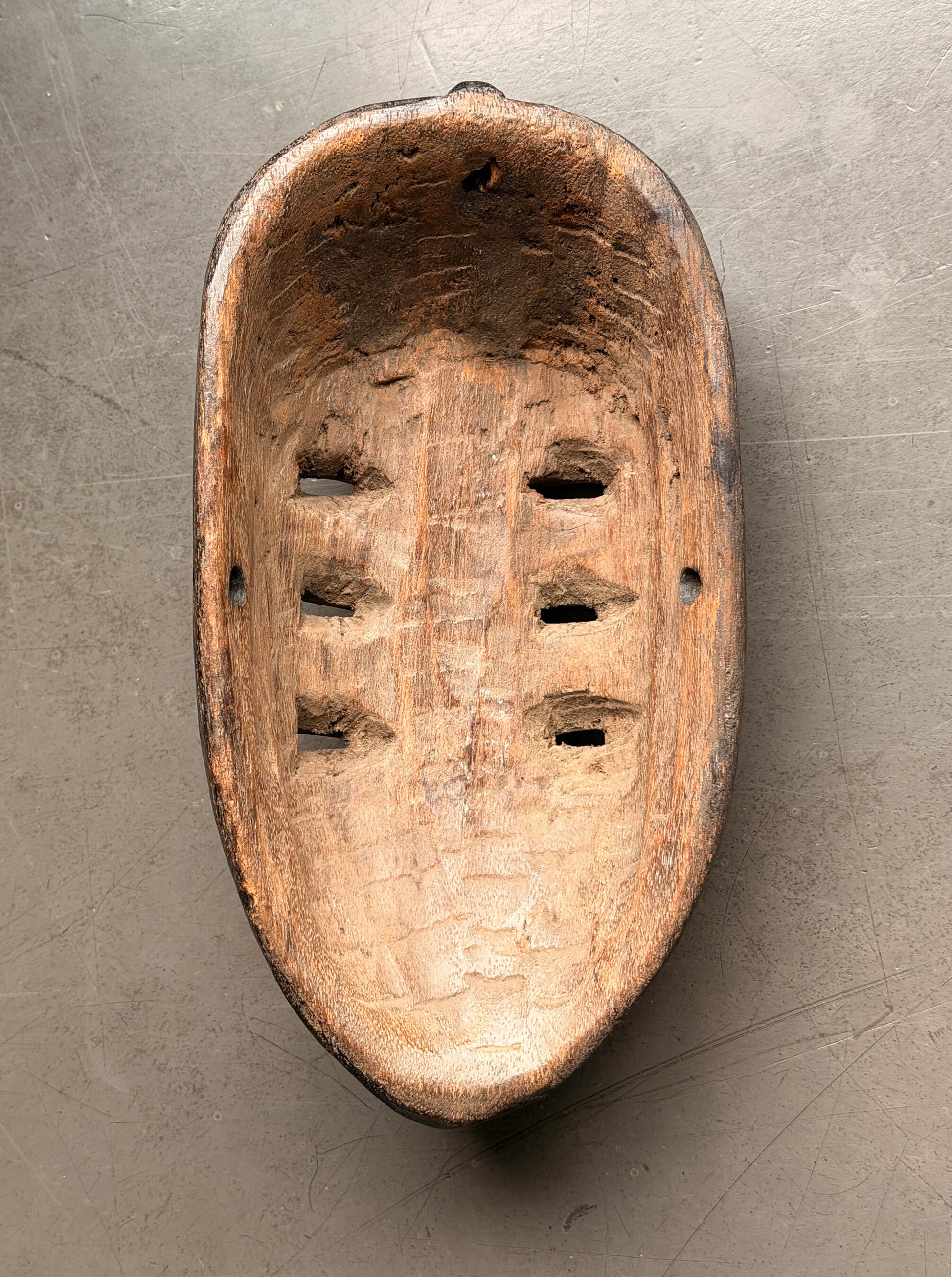 Surface wear shows natural handling and light smoke exposure, with a darkened exterior contrasting against the lighter exposed wood of the eye openings. Interior oxidation and dryness are consistent with age and long-term environmental exposure. Overall, this mask retains strong regional integrity and symbolic coherence, reflecting a carver deeply familiar with Dan Guro visual language and ritual logic.