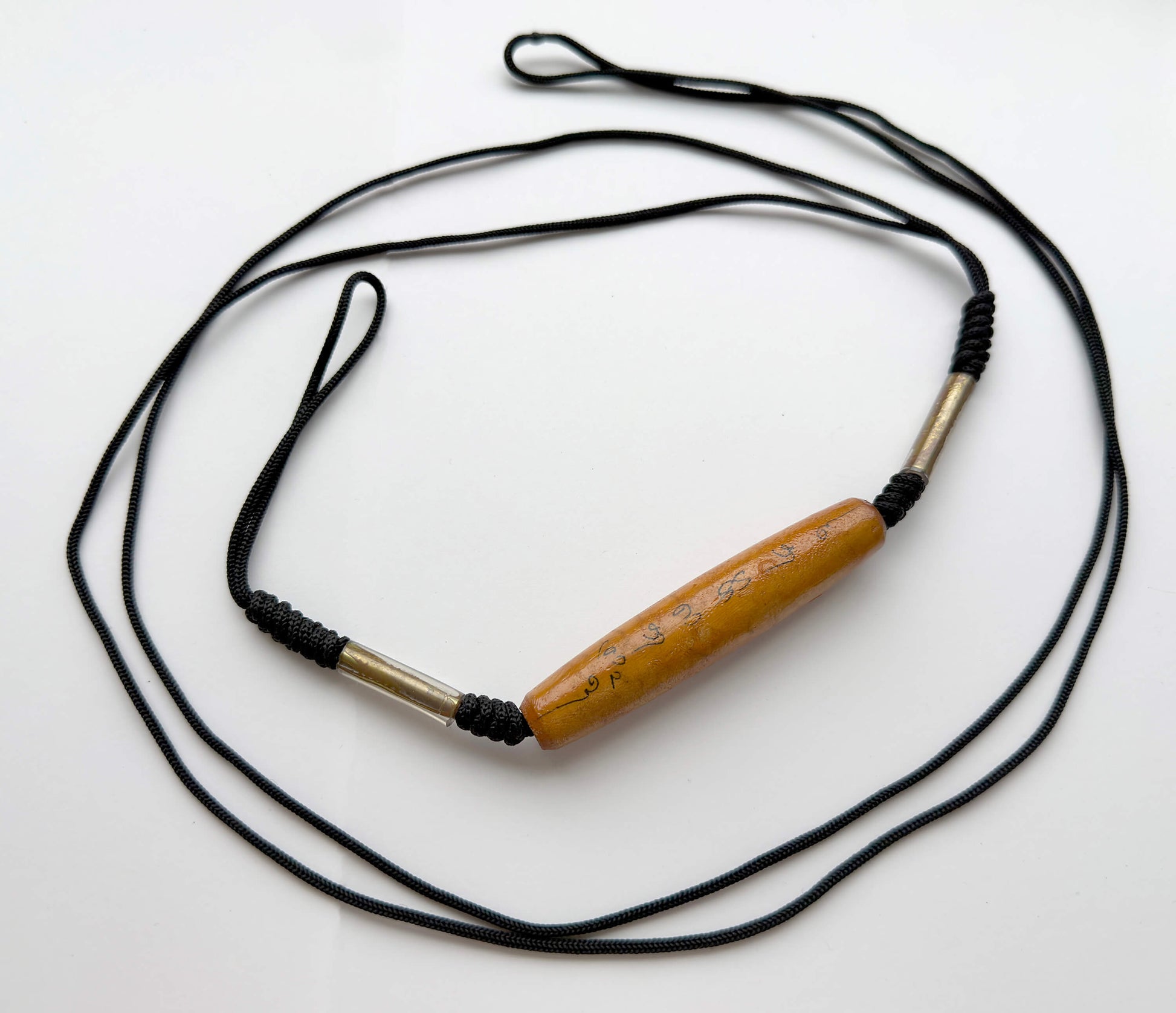 The extended black cord and reinforced knotting indicate intentional body wear, consistent with sashes used by practitioners, fighters, travelers, or devotees engaging in high-risk or liminal activity. The natural wear and hand-inscribed surface suggest practical ritual use rather than decorative manufacture.